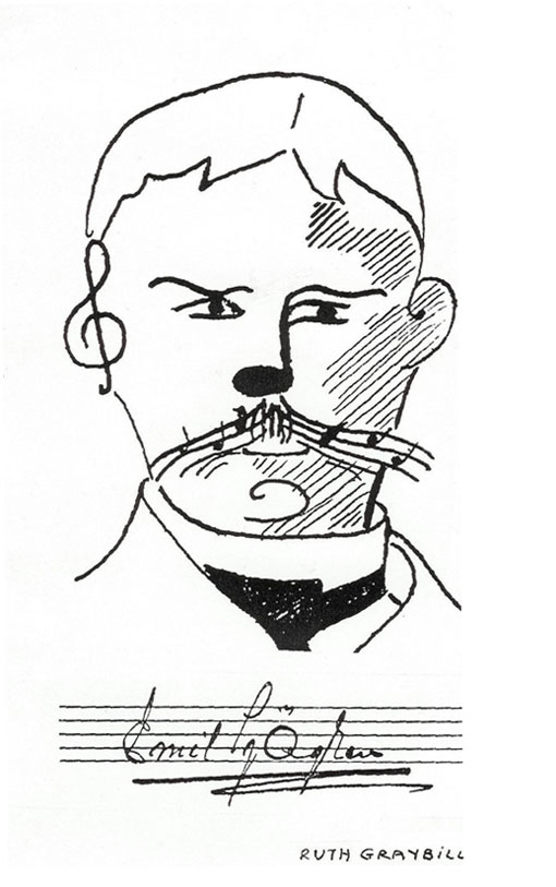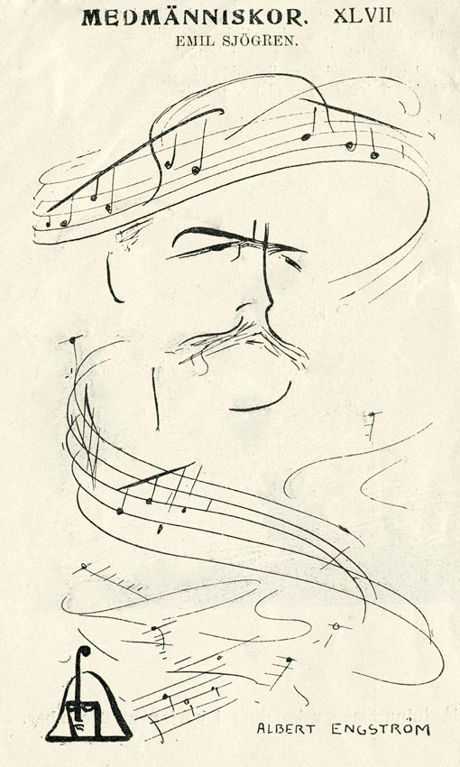 Teckning av Ruth Graybill, Malmö. Gåva till Emil Sjögren-sällskapet från Birger ”Bille-Bild” Persson, Knivsta.Teckning av Albert Engström, publicerad i tidningen Strix 17/11 1898. Reproduktionen gjord av Jens Östman/Kungl Biblioteket.Målning av Carl Larsson. Originalet finns på Kungliga Musikaliska Akademien i Stockholm.Målning av Georg Pauli. Originalet finns i Kungliga Logen på Operan i Stockholm. Den högra av de avbildade muserna håller i ett nothäfte med Emil Sjögrens sånger.Fotografi inköpt av Ingrid Lindgren.